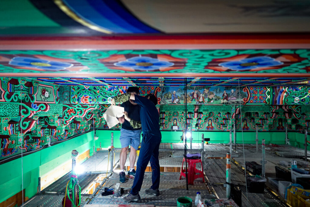 대웅전 내부, 좁고 어두운 작업 공간에서 후배들과 복원가들이 붓을 들고 있었습니다.